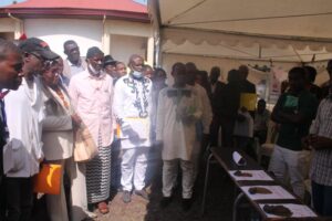 Par la suite, la caravane officielle s’est dirigée vers le stand de « creuseurs de sable » de BONEWONDA qui ont présenté les variétés de sable qu’ils mettent à la disposition des populations ainsi que leur caractéristiques, leurs particularités et les usages possibles, Le stand de l’Association des personnes pour la promotion du Bien-être en abrégé APPBE de NEWTOWN AEROPORT 2, qui a présenté les actions qu’elle a déjà eu à mener dans le cadre de l’amélioration du cadre de vie notamment le changement de 5 poteaux électriques grâce à leur plaidoyer auprès de l’entreprise ENEO[2] et l’achat de 3 buses de 70X50 pour faciliter l’écoulement des eaux stagnantes dans le bloc 6, a été visité.