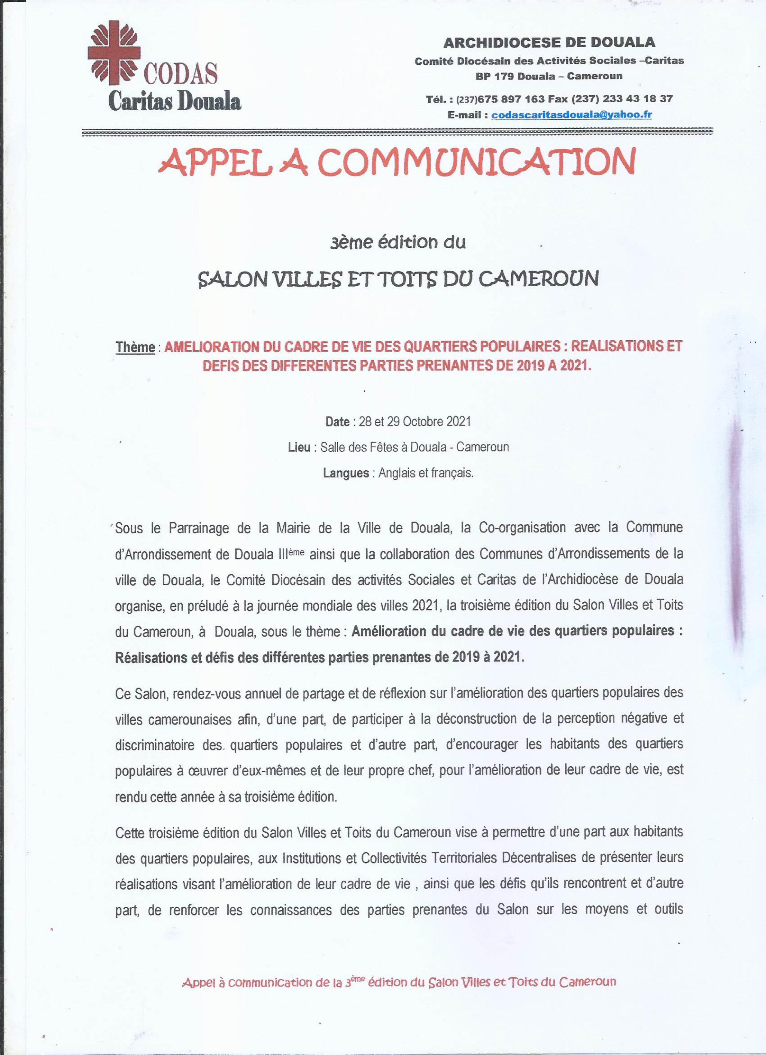 Les 28 et 29 Octobre 2021, le CODAS Caritas Douala et la Commune d’arrondissement de Douala 3 organisent la 3ème édition du SALON VILLES ET TOITS DU CAMEROUN sous la Présidence du Père Archevêque Samuel KLEDA et le Parrainage de la Mairie de la Ville de Douala.