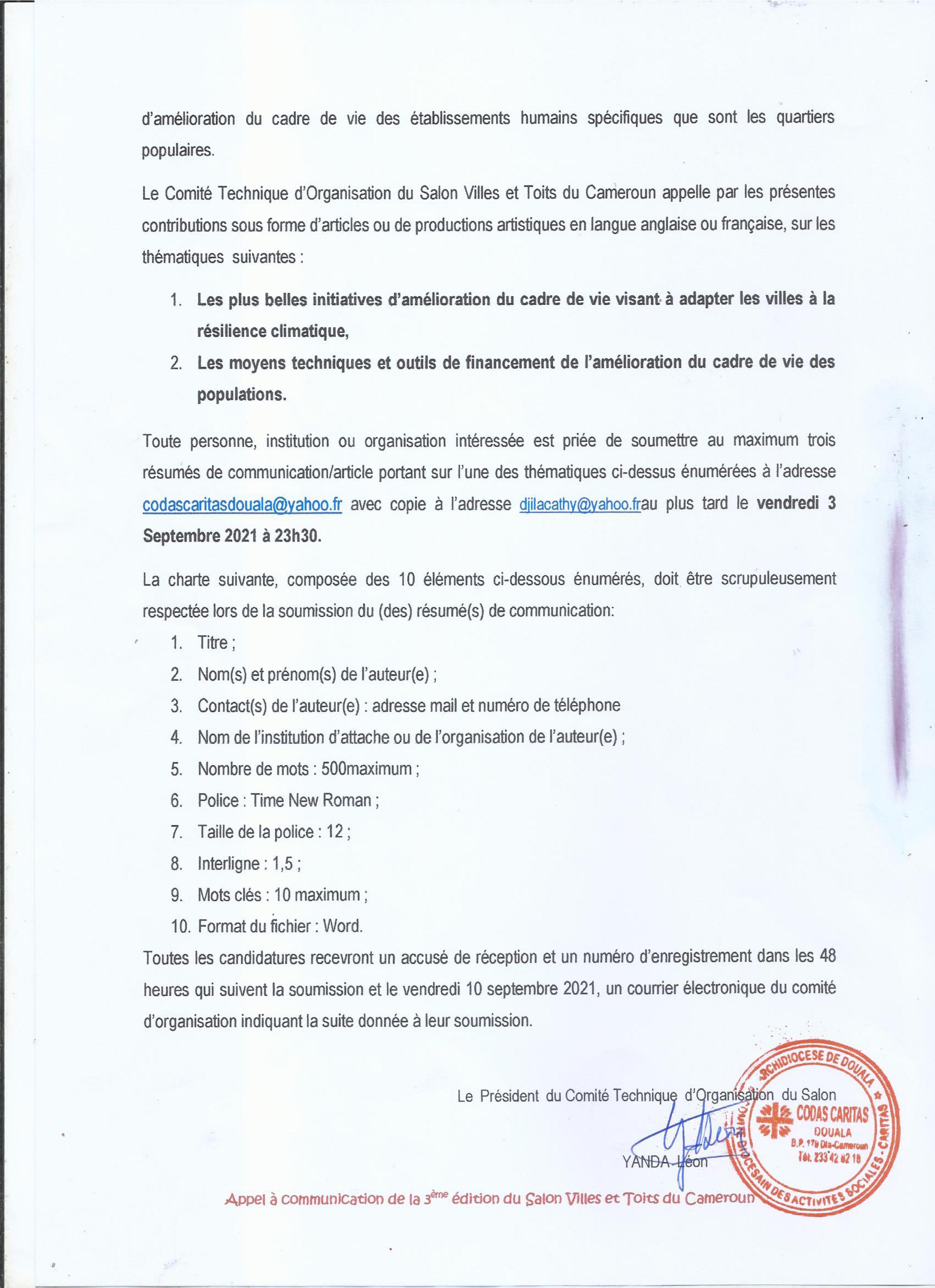 Les propositions sont attendus aux adresses suivantes: codascaritasdouala@yahoo.fr et djilacathy@yahoo.fr au plus tard le vendredi 3 septembre 2021 à 23h30.